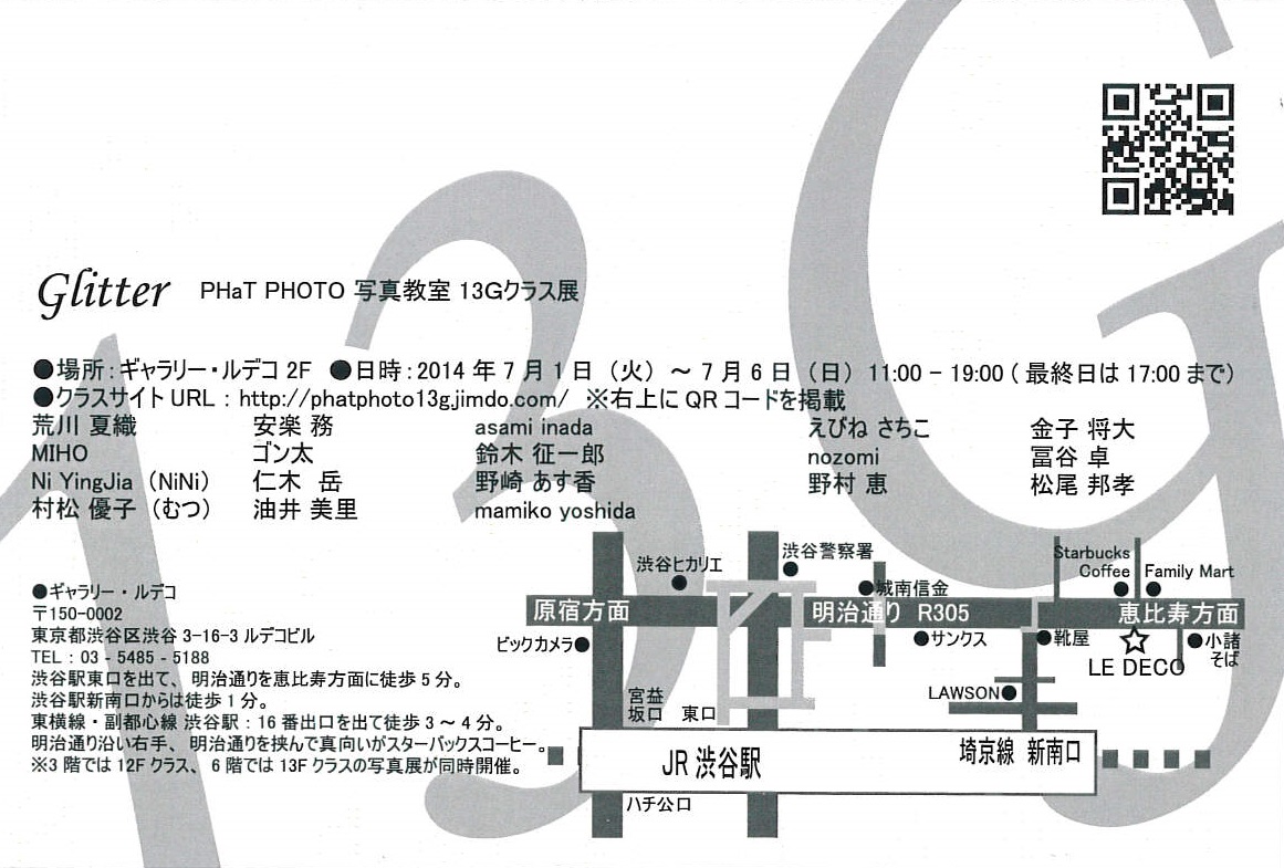 PHaTO PHOTO 写真教室 13Gクラス展 「Glitter」 LE DECO 2 / 開催終了 PHaTO PHOTO 写真教室 13Gクラス展 「Glitter」 会期…2014年7月1日(火)~7月6日(日) ジャンル…写真 クラスサイト…PHat PHOTO 13G