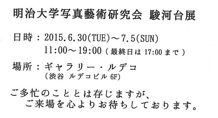 明治大学 写真藝術研究会 駿河台展 LE DECO 6 / 開催終了 明治大学 写真藝術研究会 駿河台展 会期…2015年6月30日(火)~7月5日(日) 開催時間…11:00~19:00 ※最終日は17:00まで ジャンル…写真