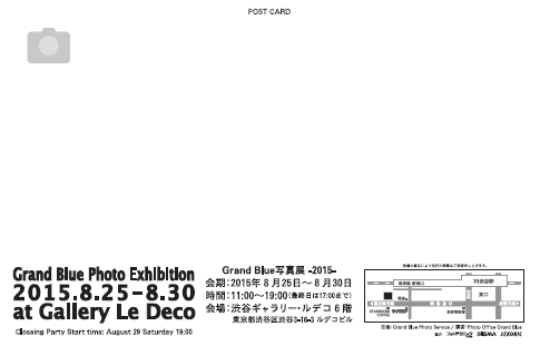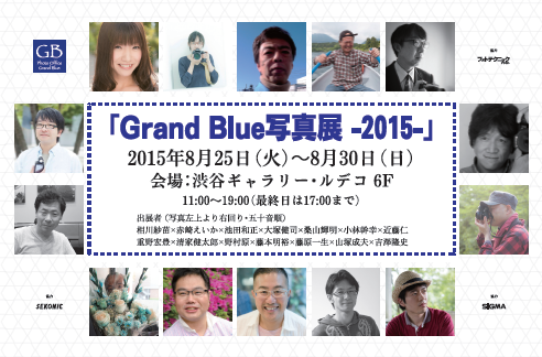 Grand Blue写真展-2015- LE DECO 6 / 開催終了 Grand Blue写真展-2015- 開催日時:2015 年8月25日(火)~8月30日(日) 開催時間:11:00~19:00(最終日は17:00 まで) 会 場:ギャラリー・ルデコ 6階 テーマ:写真で表す○○の世界 出展者 相川紗苗、赤崎えいか、池田和正、大塚健司、桑山輝明、小林幹幸、近藤仁 重野宏豊、清家健太郎、野村原、藤本明裕、藤原一生、山塚成夫、吉澤隆史