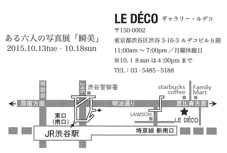 ある六人の写真展「瞬美」 LE DECO 6 / 開催終了 ある六人の写真展「瞬美」 会期…2015年10月13日(火)~10月18日(日) 時間…11:00~19:00 ※最終日は16:00まで ジャンル…写真