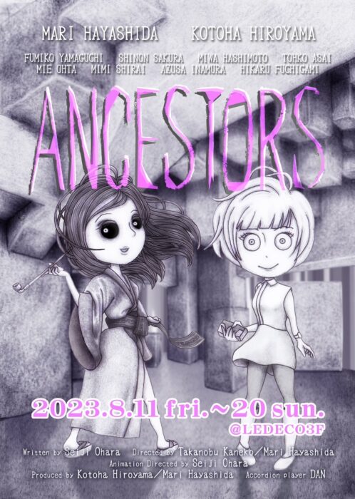 「ANCESTORS」 LE DECO 3 / 開催終了 アニメーション×アコーディオン演奏×演劇 舞台「ANCESTORS」 作・アニメ監督 小原正至 演出 金子貴伸/林田麻里 出演(2人芝居×5チーム) A林田麻里/広山詞葉 B山口芙未子/朔良しのん C橋本美和/朝井瞳子 D太田美恵/白井美海 E稲村梓/渕上ひかる アコーディオン奏者 DAN ▼official HP https://projectkh2020.wixsite.com/film/ancestors ▼ticket https://teket.jp/6819/23054 前売り4000円 当日 4500円
