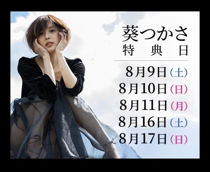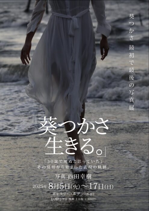 『葵つかさ 生きる。」 LE DECO 6 / 開催終了 【期間】 2025年8月5日〜17日 【時間】 平日/14時〜20時 土日祝/12時〜20時 最終日/12時〜17時 【入場料】 平日/無料、土日祝/1,800円 https://www.8man.jp/aoitsukasa2025/