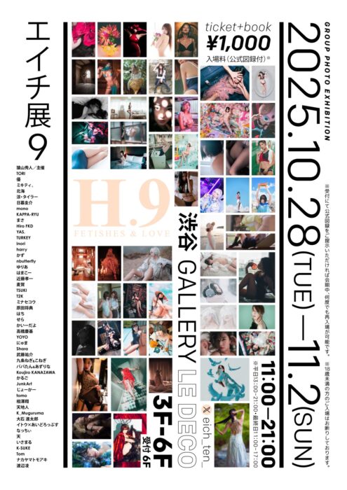 エイチ展9 LE DECO 3 / 開催終了LE DECO 4 / 開催終了LE DECO 5 / 開催終了LE DECO 6 / 開催終了 会期:2025年10月28日(火)〜11月2日(日) 会場:ギャラリー・ルデコ(渋谷)3F〜6F 開場時間:平日 13:00〜21:00 / 最終日 11:00〜17:00 入場料 1000円(公式図録付)