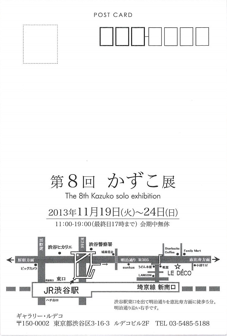 第8回 かずこ展 LE DECO 2 / 開催終了 The 8th Kazuko solo exhibition 第8回 かずこ展 会期…2013年11月19日(火)~24日(日) 11:00am~19:00pm(最終日は17:00まで) ジャンル…油絵