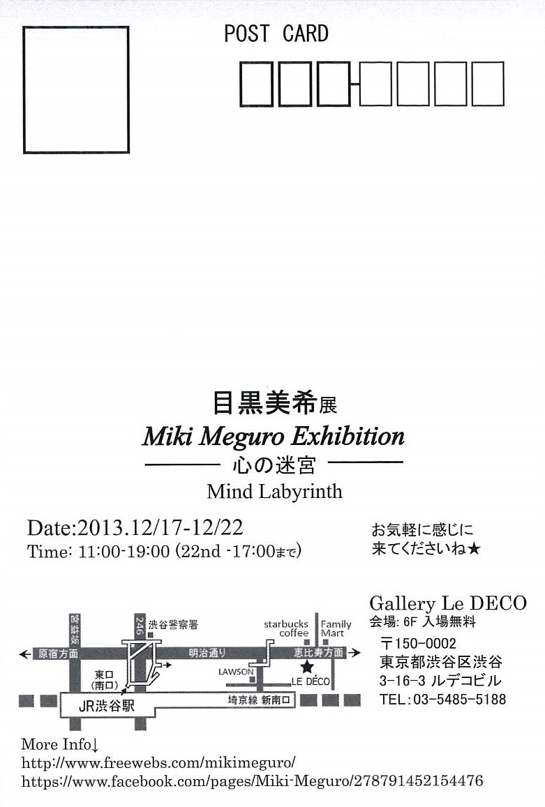 目黒美希展 – 心の迷宮/Miki Meguro Art Exhibition – Mind Labyrinth LE DECO 6 / 開催終了 目黒美希展 – 心の迷宮/Miki Meguro Art Exhibition – Mind Labyrinth 日時:12月17日- 12月22日 時間:11時-19時、最終日17時まで 会場: 6階 内容:内面、社会、自然をテーマに、ちょっとダークで、スピリチャルな空間を油彩、アクリル、半立体、ライトワーク等様々な表現で演出します。 Miki Meguro Art World:WEBSITE Facebook:WEBSITE