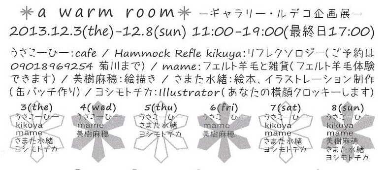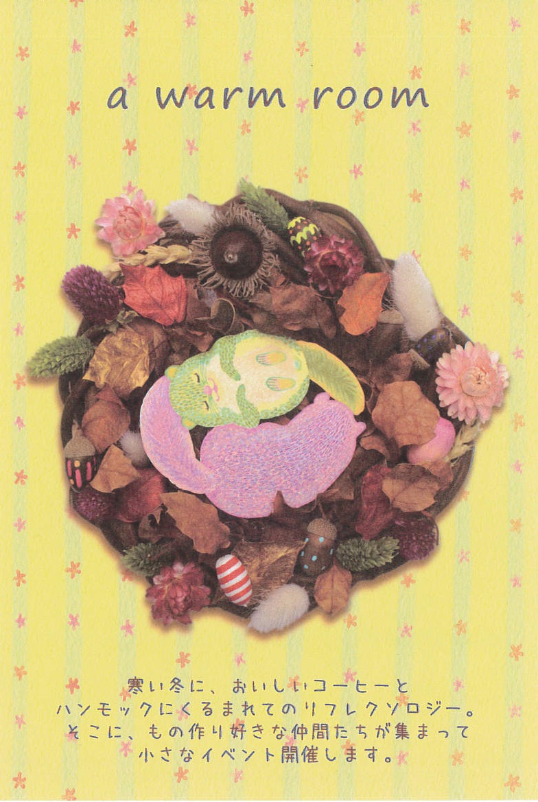 「a warm room」 LE DECO 1 / 開催終了 a warm room 寒い冬に、おいしいコーヒーと ハンモックにくるまれてのリフレクソロジー。 そこに、もの作り好きな仲間たちが集まって ちいさなイベント開催します。 会期…12月3日(火)~12月8日(日)